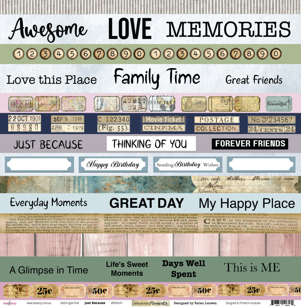 A beautiful collection of 12" x 12" scrapbooking paper exclusively designed by Karen Louren as part of the Measured Moments range.