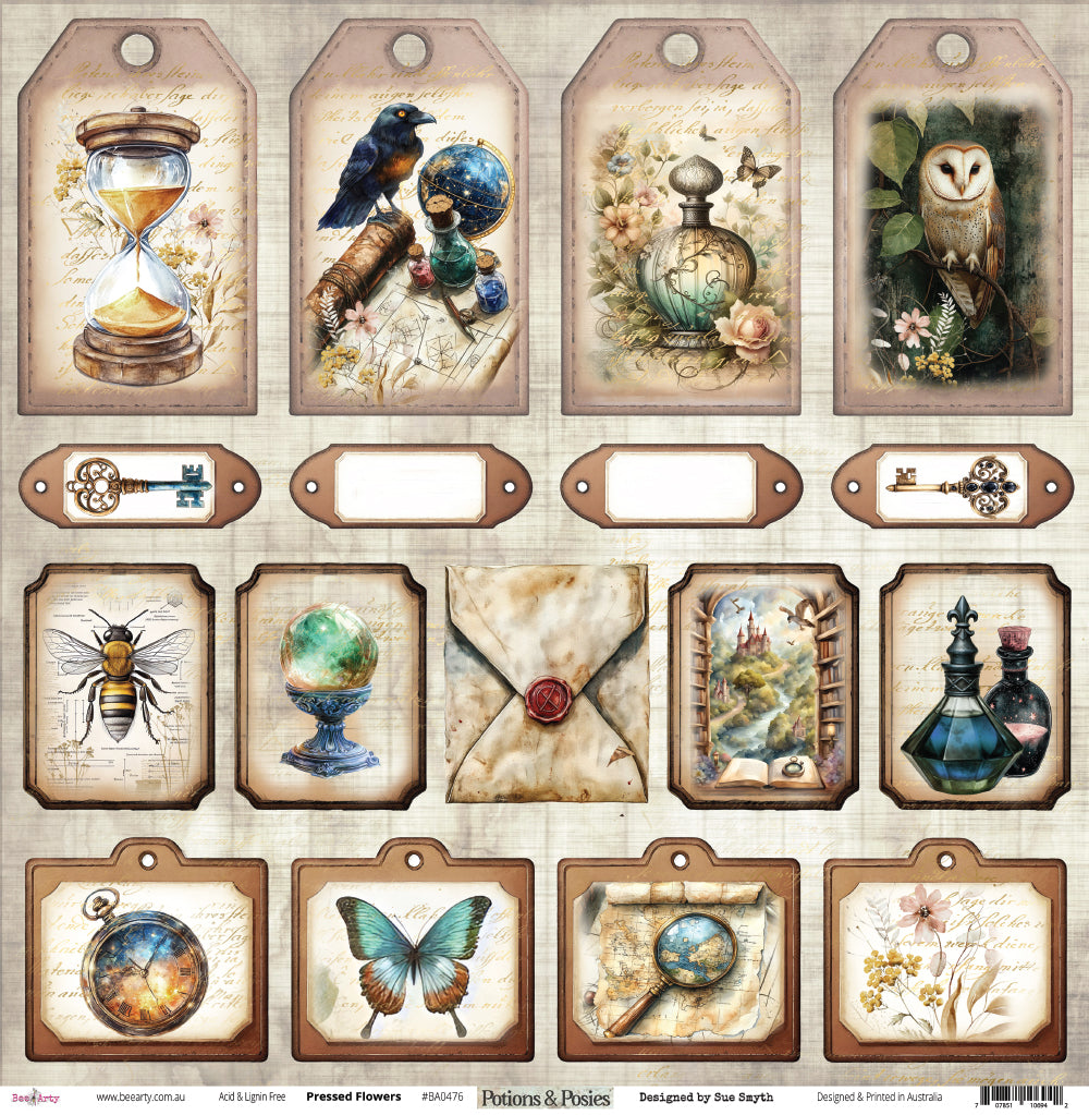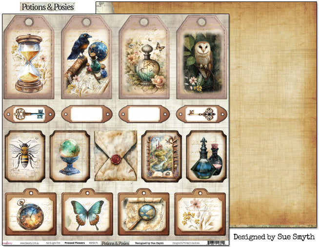 Double sided 12" x 12" scrapbooking paper exclusively designed by Sue Smyth as part of the Potions & Posies range.